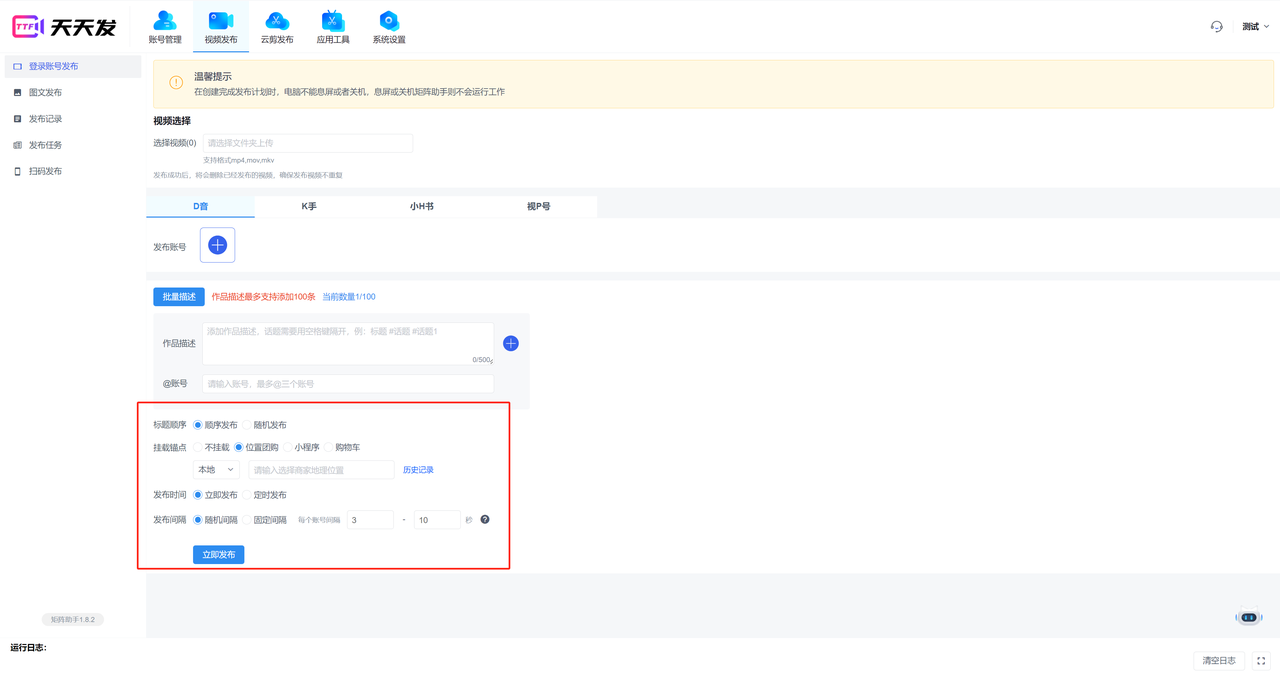 3、视频一键批量分发,定时定量分发,多种发布模式一个人就可以操作成百上千账号