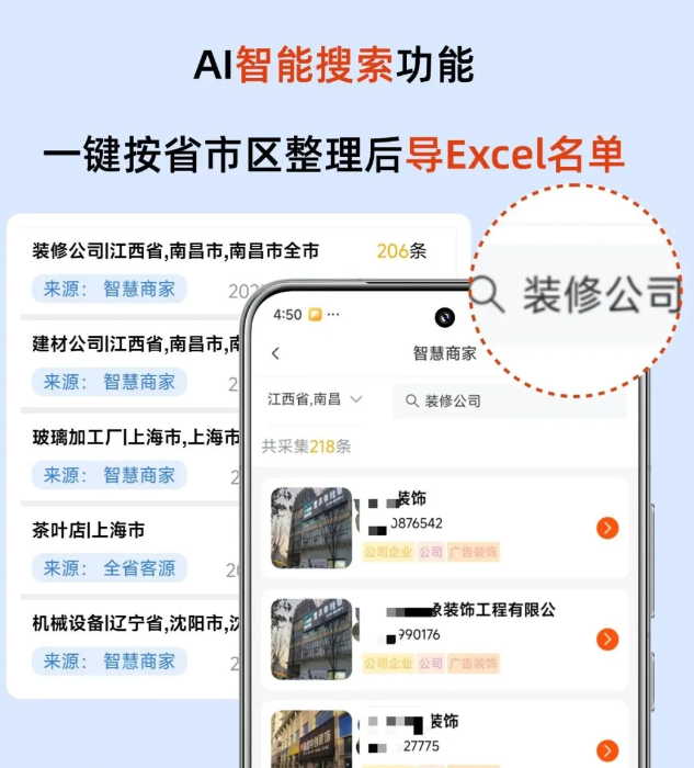 :按省、市、区县、行业关键词、甚至特定写字楼进行地毯式搜索。 - 一键导出