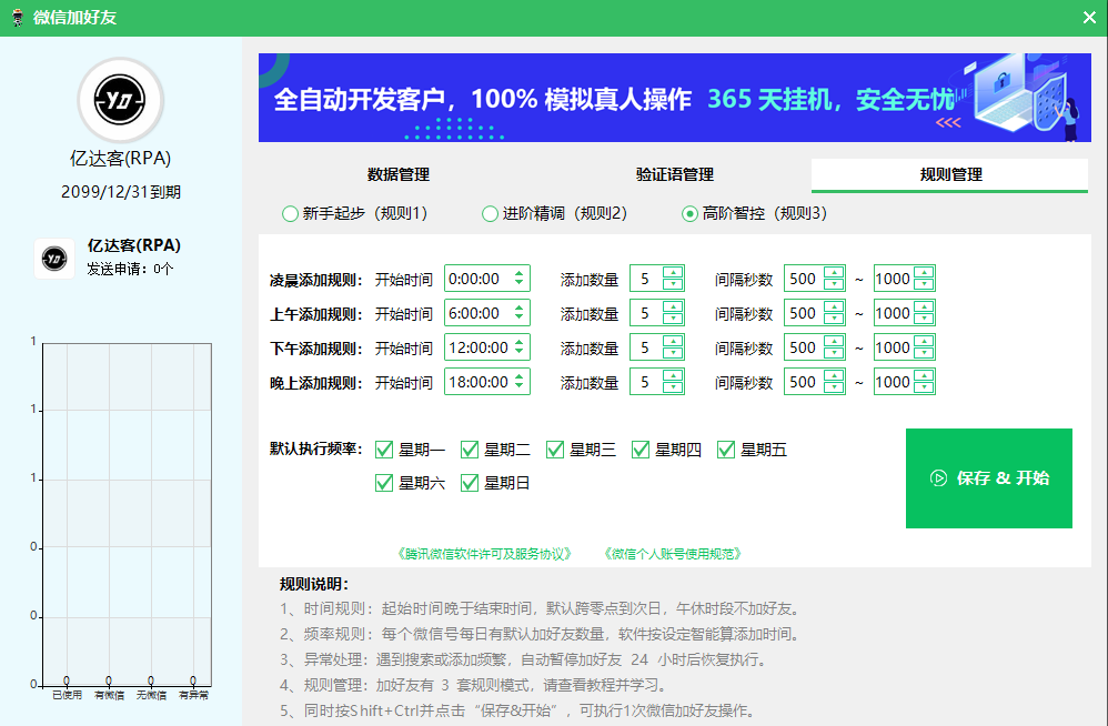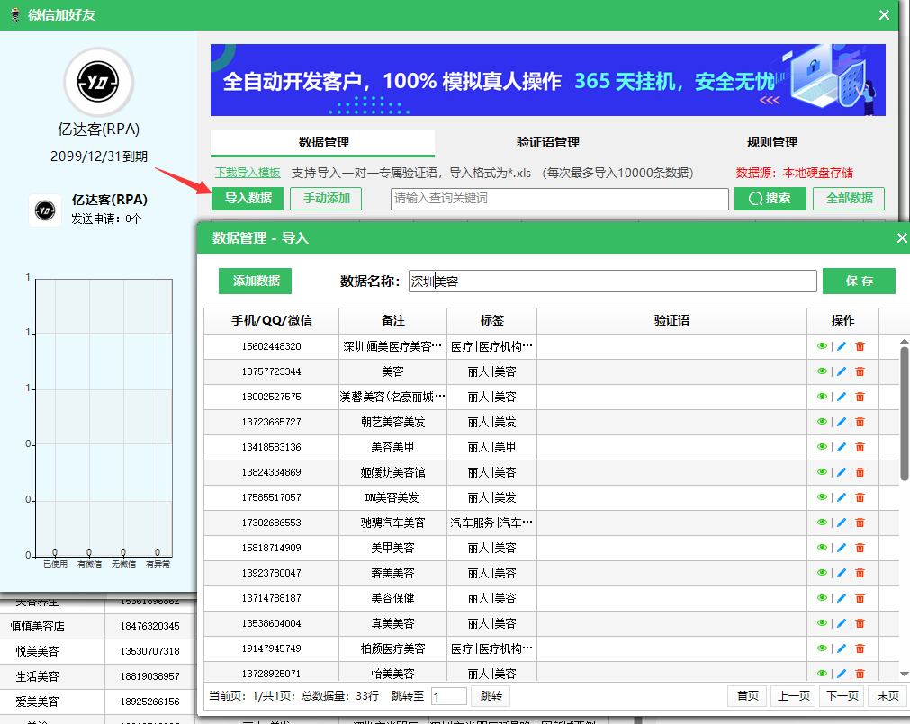 - 精准:亿达客RPA筛号 + 模拟人工按条件添加,90% 都是目标客户;
